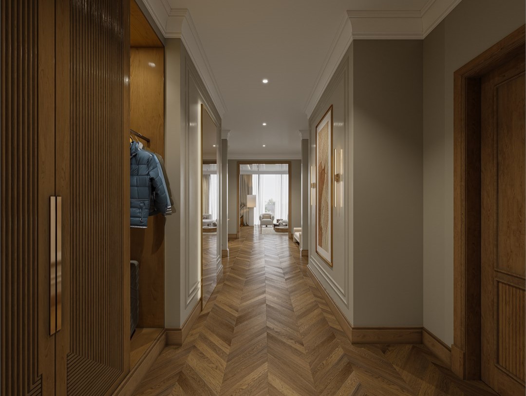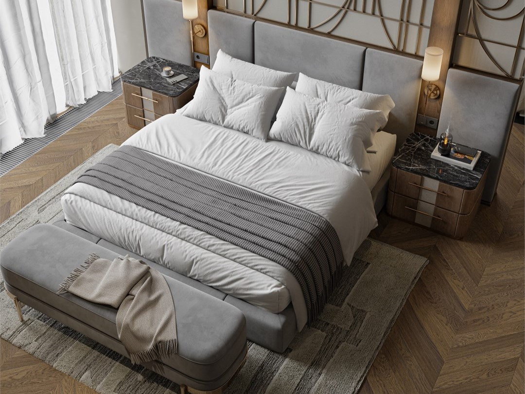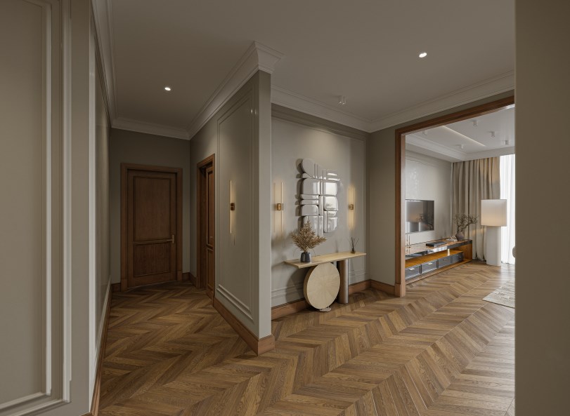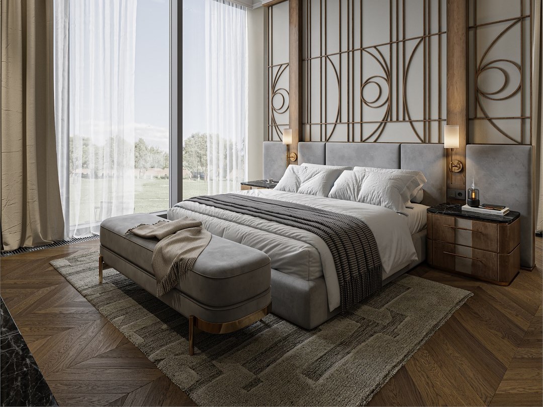 - Мебель: вешалка, зеркало, кровать двуспальная, прикроватные тумбочки, стол, стул, шкаф