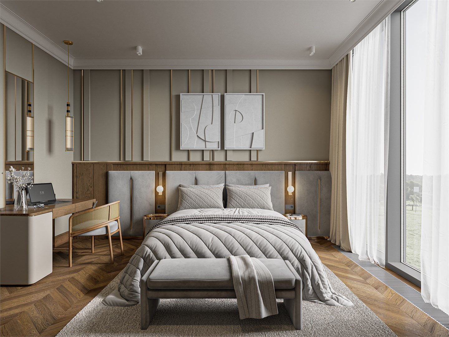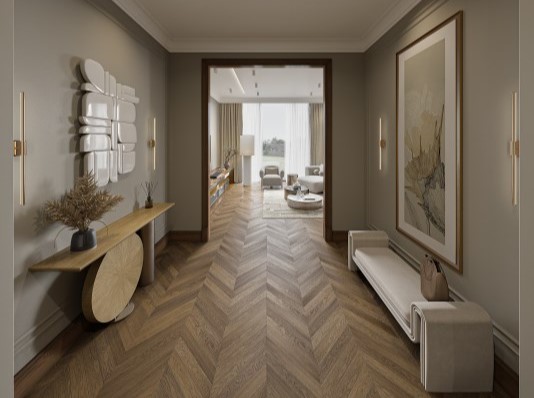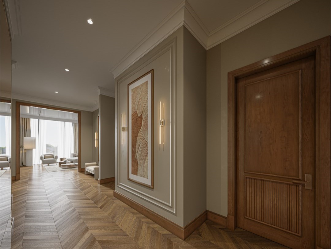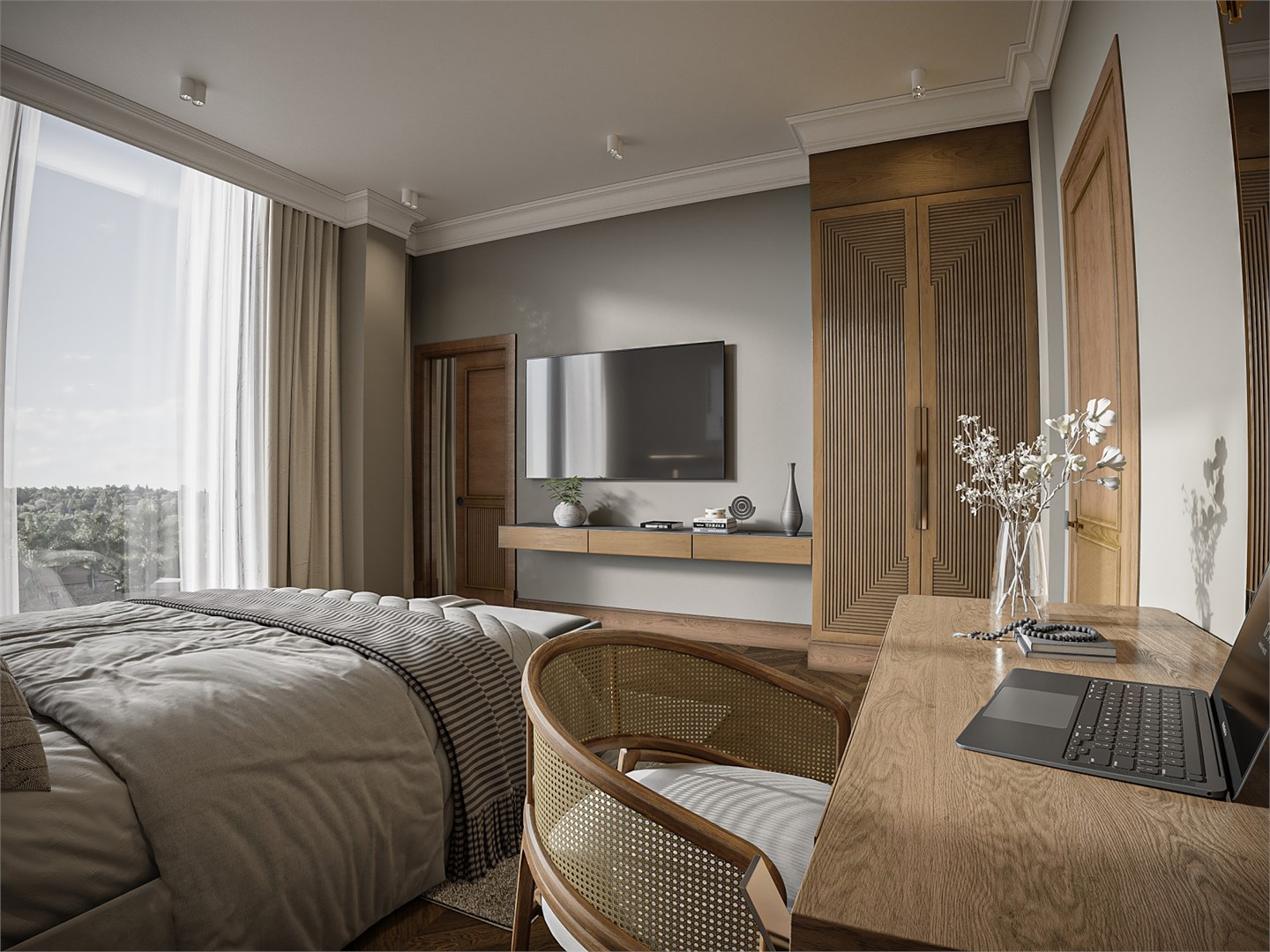 - Мебель: вешалка, зеркало, кровать двуспальная, прикроватные тумбочки, стол, стул, шкаф